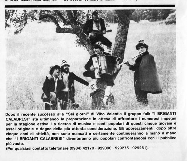 Erano i primi anni '70 quando Michele Gioia, Tonino Montalto, Franco Altomare e Giuseppe Brogno iniziarono un'avventura che li avrebbe portati ad esibirsi sulle piazze della Calabria e del meridione d'Italia.Essi diffondevano il nostro patrimonio folclorico musicale con semplicità, spensieratezza, allegria, ma nel contempo con un serio ed impegnato lavoro di ricerca. Venivano interpellati gli anziani, facendo cantare loro i vecchi motivi popolari, spesso sconosciuti alle nuove generazioni; e poi erano registrati, trascritti e rielaborati ( cercando di renderli il più fedele possibile alle versioni originali). Questo appassionato "scavo" della tradizione musicale, Luzzese in particolare e calabrese più in generale, costituisce (allora come oggi) l'essenza qualificante del Gruppo. La pista tracciata non è mai stata abbandonata, non vi sono mai stati ripiegamenti o tentennamenti. I Briganti hanno sempre avuto la convinzione che riscoprire e rinverdire le proprie radici culturali è opera utile e necessaria al fine di meglio comprendere chi siamo e dove andiamo. In questo contesto, sono stati riscoperti e valorizzati canti sepolti nella memoria dei più anziani come "U Cacciaturi", "A Vecchiareddra", "Zà Monacheddra", "Sacristanieddru", che hanno riscontri oggettivi con fatti e personaggi reali. Sulla scia della tradizione popolare, Tonino Montalto (per le parole) e Franco Altomare (per la musica) hanno composto nuovi canti in vernacolo, che ripercorrendo le vecchie piste, hanno il fascino e la musicalità di quelli più antichi. E' il caso di "Tiemvi belli" o di " Notti i gilusia". Al nucleo originario si sono aggiunti gli altri componenti, Ivano Sena, Francesco Longo e Roberto Polizzo che insieme a Tonino Montalto e Franco Altomare costituiscono l'attuale organico. E chi ne è uscito (per motivi di lavoro) rimane, oltre che un caro amico, un prezioso collaboratore sempre vicino al Gruppo: è il caso di Michele Gioia che pur nei suoi molteplici e faticosi impegni professionali è rimasto sempre a contatto con l'attività artistica dei Briganti. Un altrò "compagno" di cordata, anch'egli componente del Gruppo per un certo periodo di tempo, è Fabio Pepe che ha apportato, e ancora oggi apporta, un fattivo contributo all'attività musicale dei Quintetto. Insomma essere "Briganti" è la consapevolezza viscera1e di appartenere ad un "branco", legato da vincoli profondi costituiti da una smisurata passione per la musica e per le tradizioni popolari; far parte dei Briganti significa essere complici, legati da un'amicizia "sanizza cumu chiri tiempi belli".